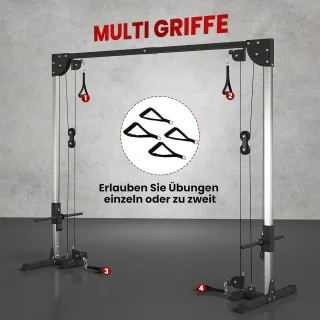 - Compleet geleverd met grepen: Inclusief vier handvatten zodat je meteen kunt variëren in greep en oefening — van nauwkeurige isolatieoefeningen tot compound bewegingen.